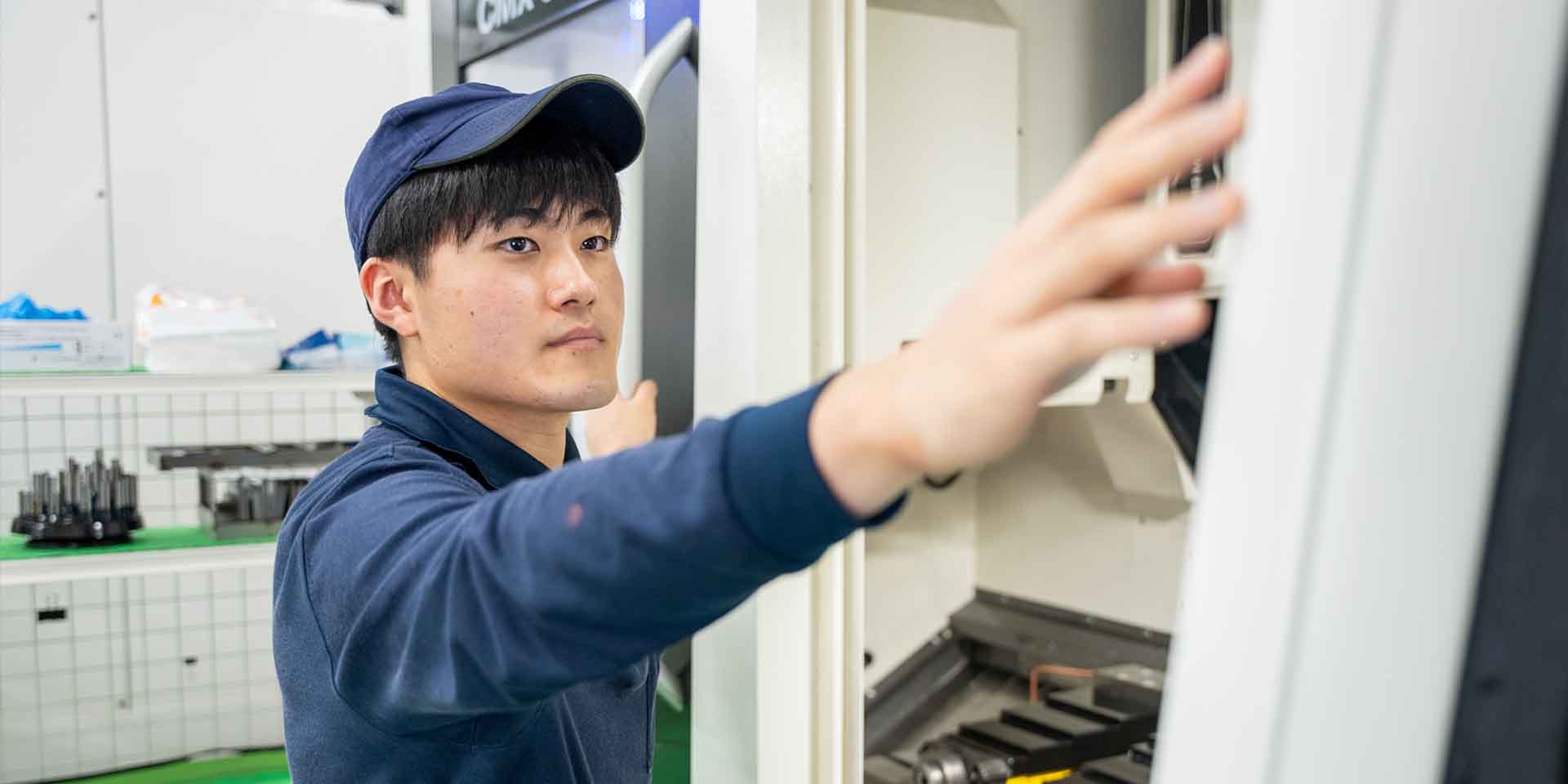工具の交換、材料のセットをして、マシニングセンタで製品を加しています。